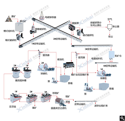 鑫海在對該項目鐵礦進行選礦試驗后,根據礦石性質特點,決定采用鑫海三段開路破碎,一粗、一精、一掃的磁選流程。原礦經過破碎磨礦后,磨礦產物返回分級機,構成一次閉路循環,粗粒中礦返回閉路循環,細粒返回原作業。之后分別采用鑫海永磁筒式磁選機進行一次粗選,一次精選以及一次掃選磁選作業,最終獲得合格的鐵精礦。
