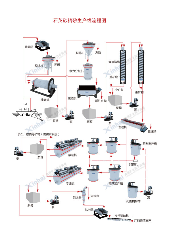 石英砂除雜工藝是將原料石英砂,通過擦洗脫泥、磁選、溜槽重選、浮選、酸洗或幾種方法聯(lián)合作業(yè),去除石英砂中的礦物雜質(zhì),獲得粒度和雜質(zhì)含量均符合要求的高純石英砂。