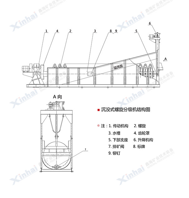 一般鑫海沉沒式螺旋分級機在溢流堰端有4-5個螺旋葉,全部沉沒在礦漿中。該種分級機沉降區面積較大,分級池深,螺旋的攪動對礦漿表面影響較小。所以分級面平穩,溢流量大而細。