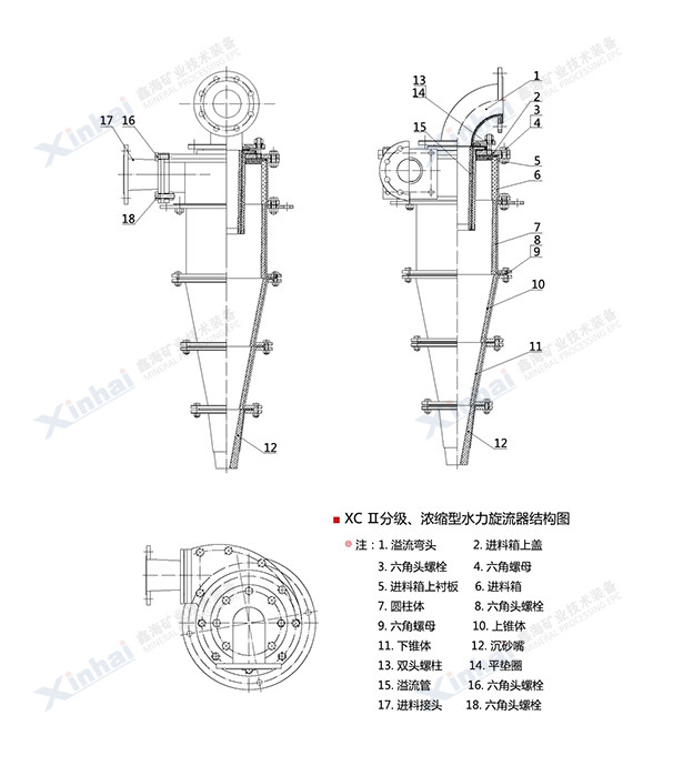 【產品改進】:鑫海水力旋流器采用漸開線給料方式,這種漸開線式給料口有利于增大物料的離心力,提高分級效果,大大減輕進料箱的磨損。