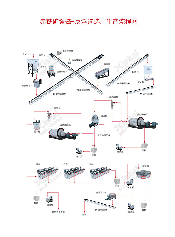 【工藝介紹】:赤鐵礦是一種弱磁性鐵礦石,所用的選礦方法很多。傳統的選礦方法包括焙燒磁選、浮選和強磁選,但是單一流程的指標較差,目前多采用集中方法聯合的流程。根據赤鐵礦選礦工藝的特點,可劃分為焙燒磁選流程,浮選流程,弱磁-強磁流程,強磁浮選流程以及重-磁-浮聯合流程。